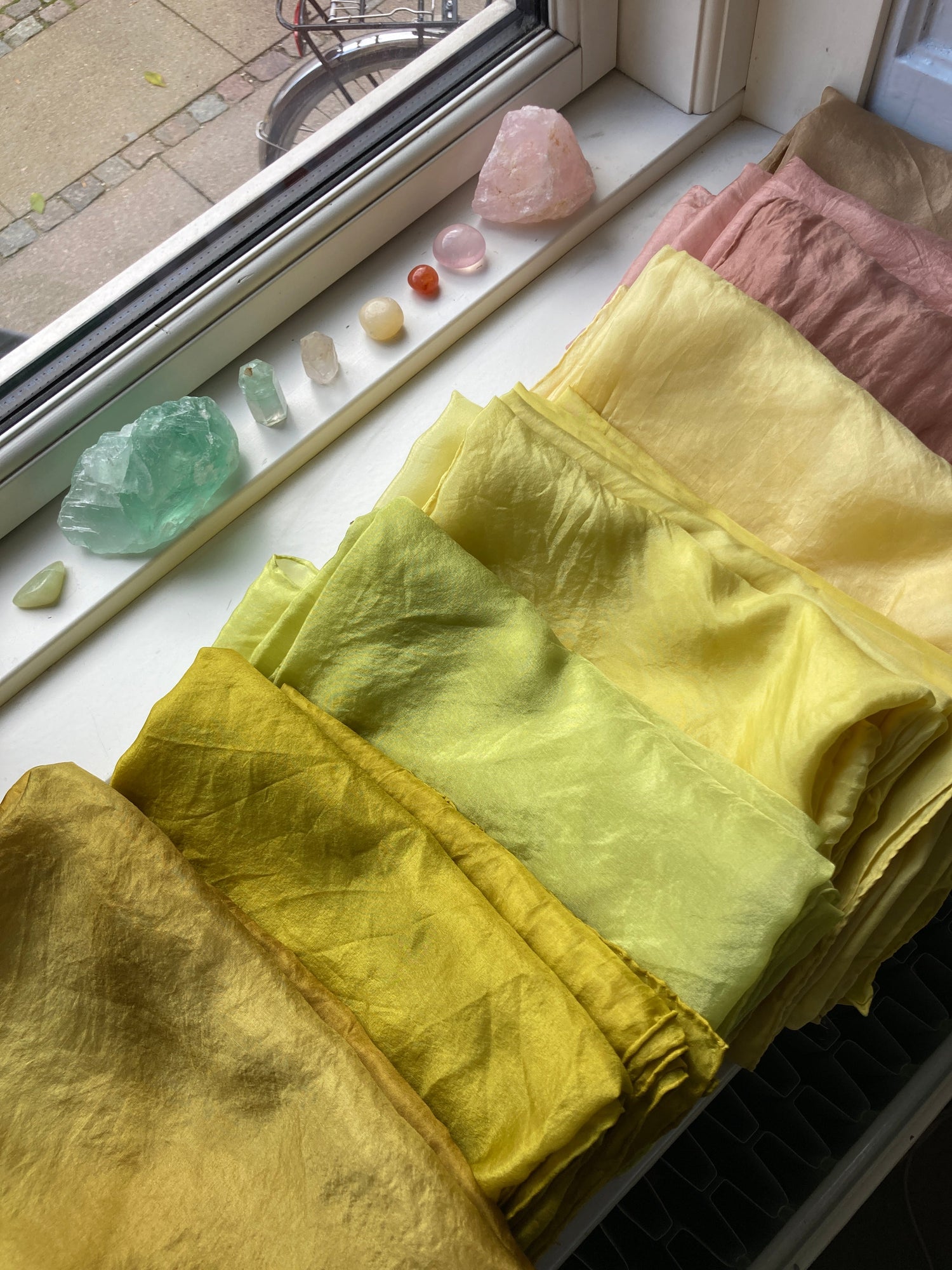 Plantefarvede tørklæder i 100% silke. Hvert tørklæde er unikt og håndfarvet med...
