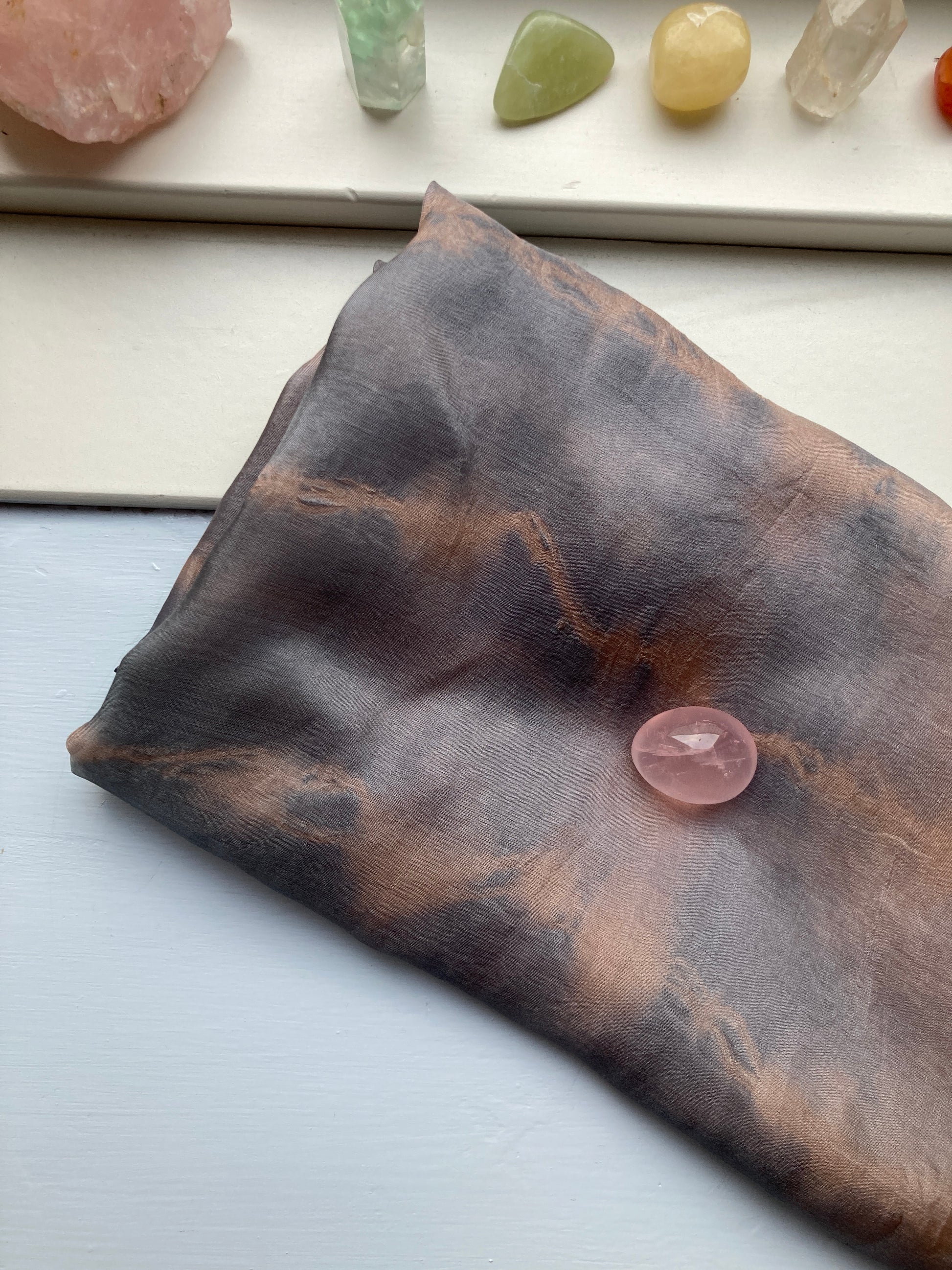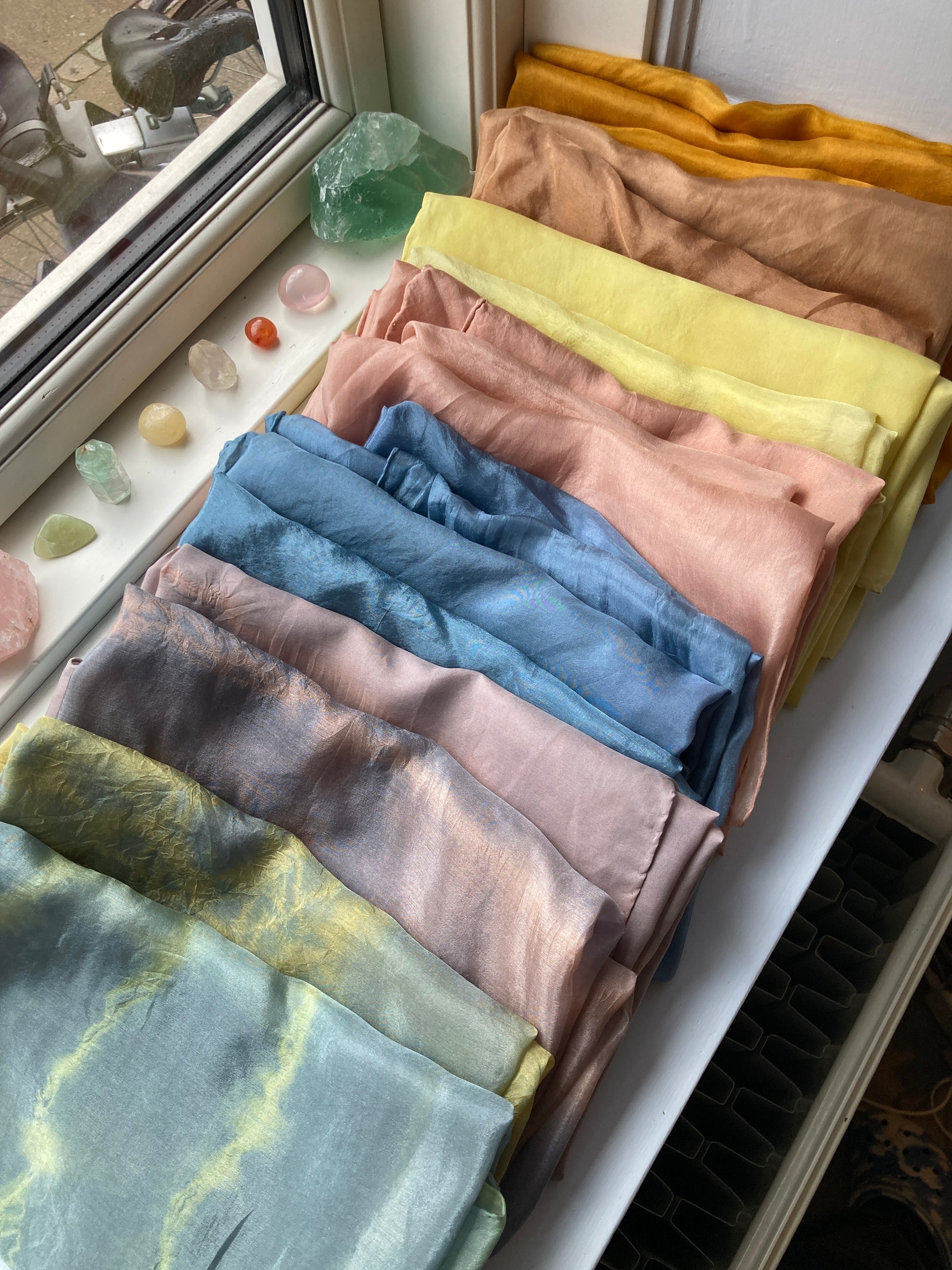 Hvert tørklæde er unikt. Når man plantefarver vil indfarvningen som regel være levende og organisk, hvilket kan medføre små smukke ujævnheder. Dette ser jeg ikke som fejl, men som små skønhedpletter, som giver tørklæderne karakter og personlighed.