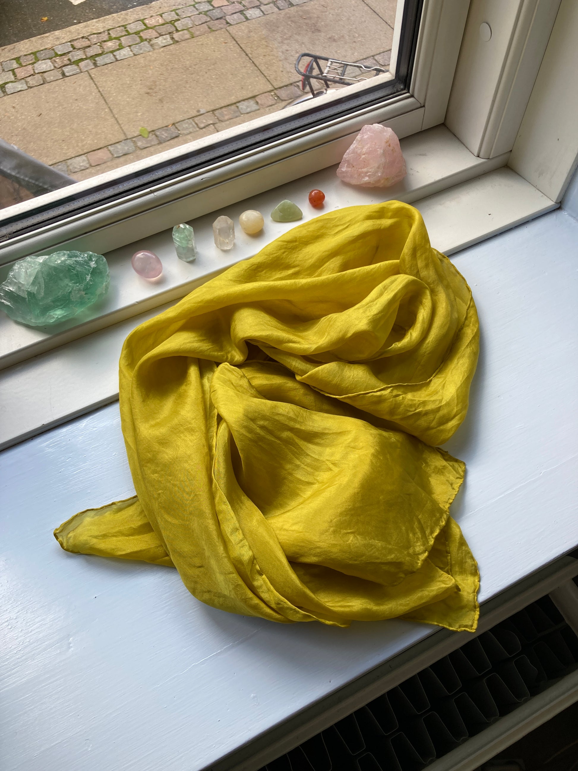 Silketørklæde i 100% silke, farvet med gyldenris fra Stevns.