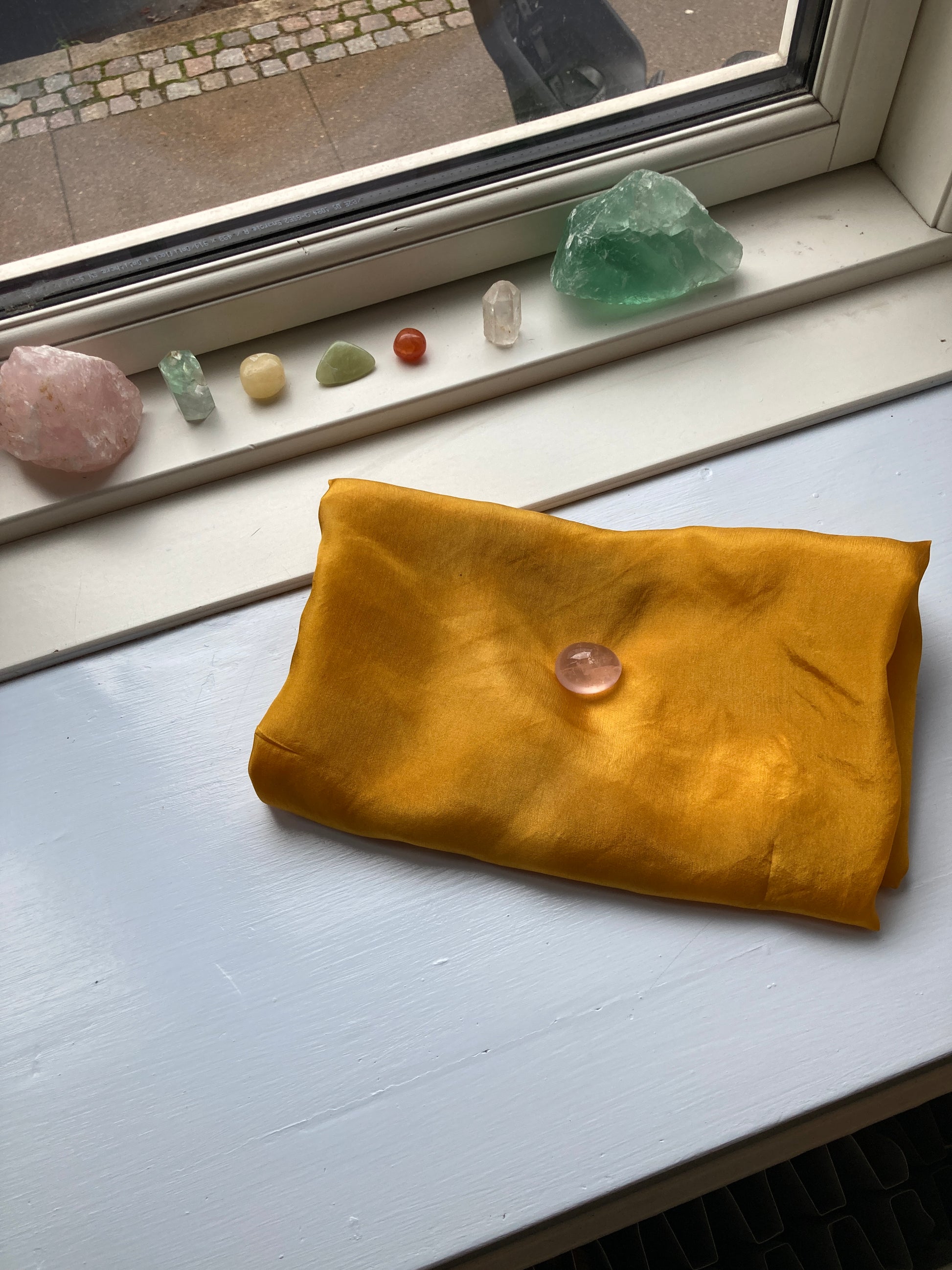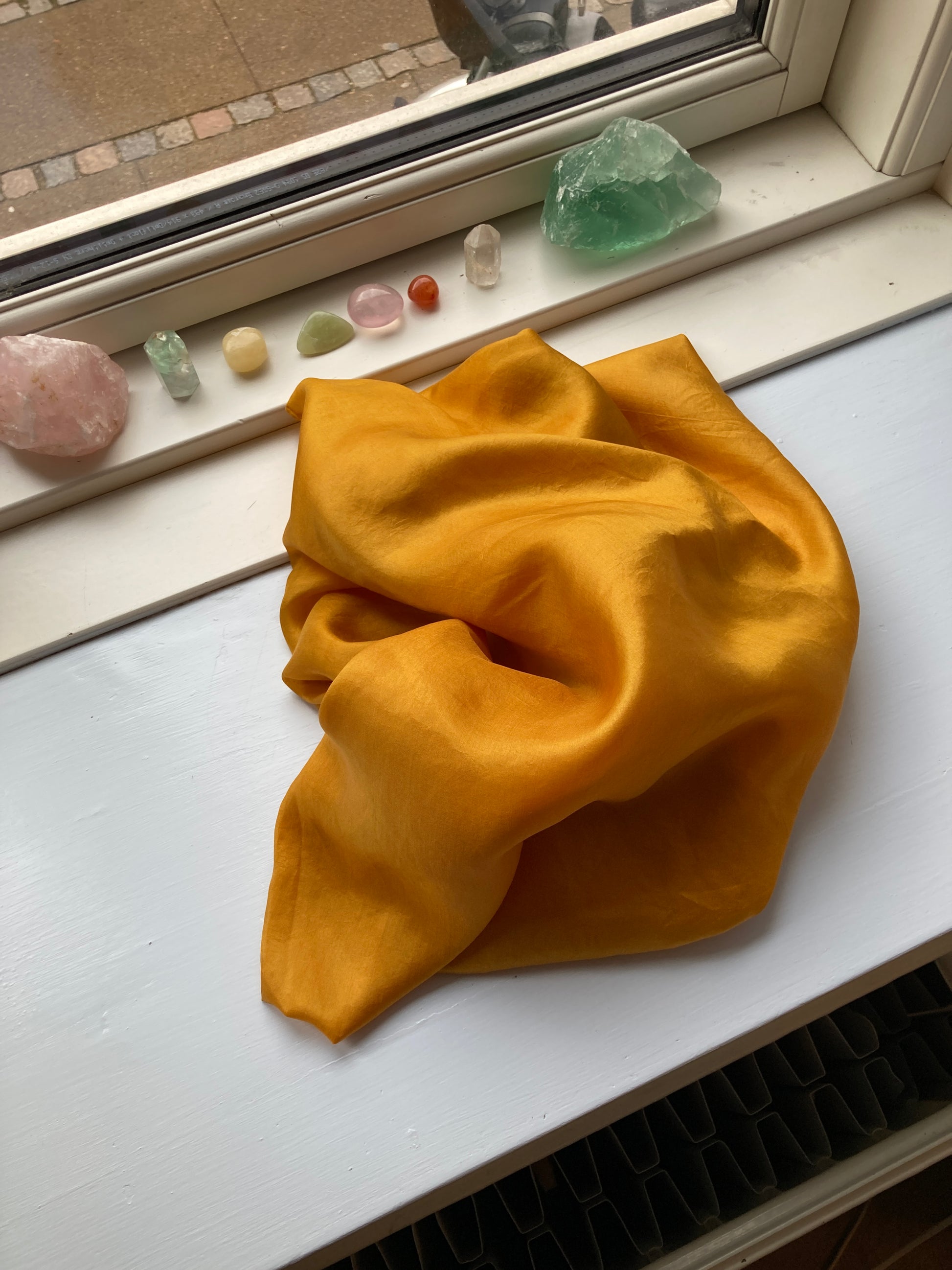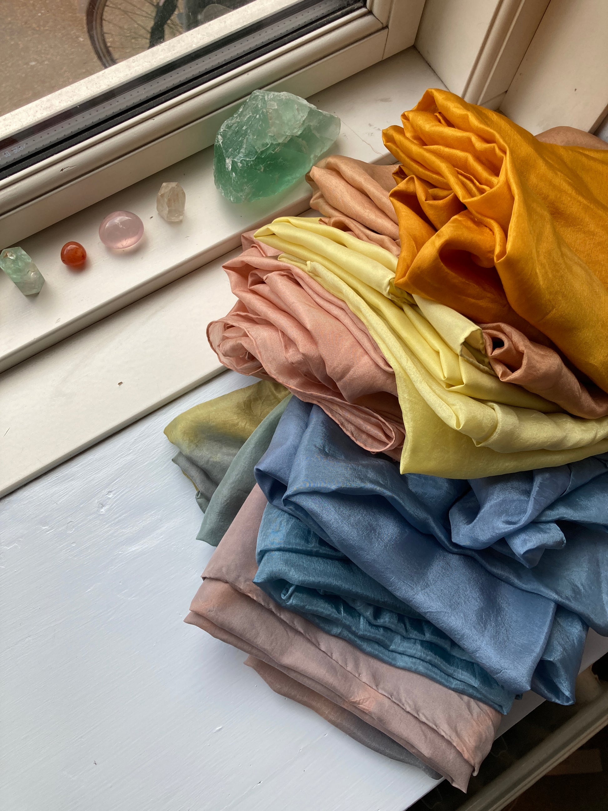 Hvert tørklæde er unikt. Når man plantefarver vil indfarvningen som regel være levende og organisk, hvilket kan medføre små smukke ujævnheder. Dette ser jeg ikke som fejl, men som små skønhedpletter, som giver tørklæderne karakter og personlighed.