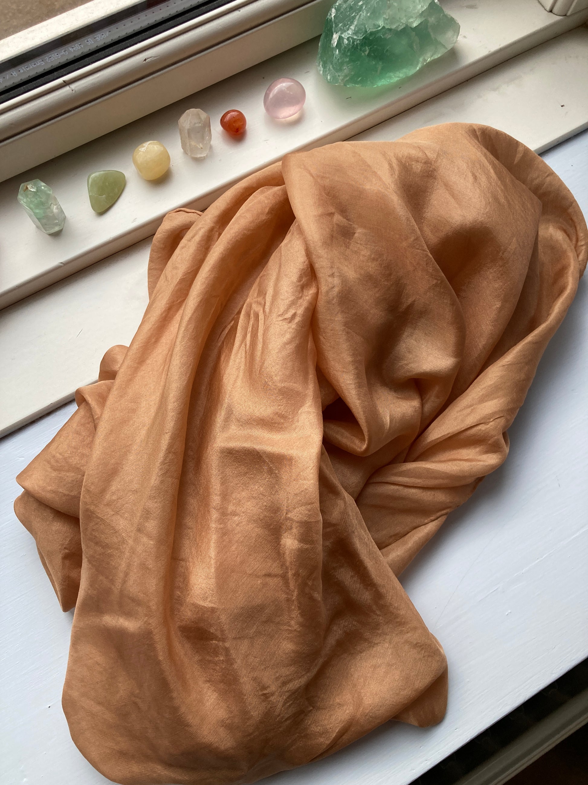 Hvert tørklæde er unikt. Når man plantefarver vil indfarvningen som regel være levende og organisk, hvilket kan medføre små smukke ujævnheder. Dette ser jeg ikke som fejl, men som små skønhedpletter, som giver tørklæderne karakter og personlighed.