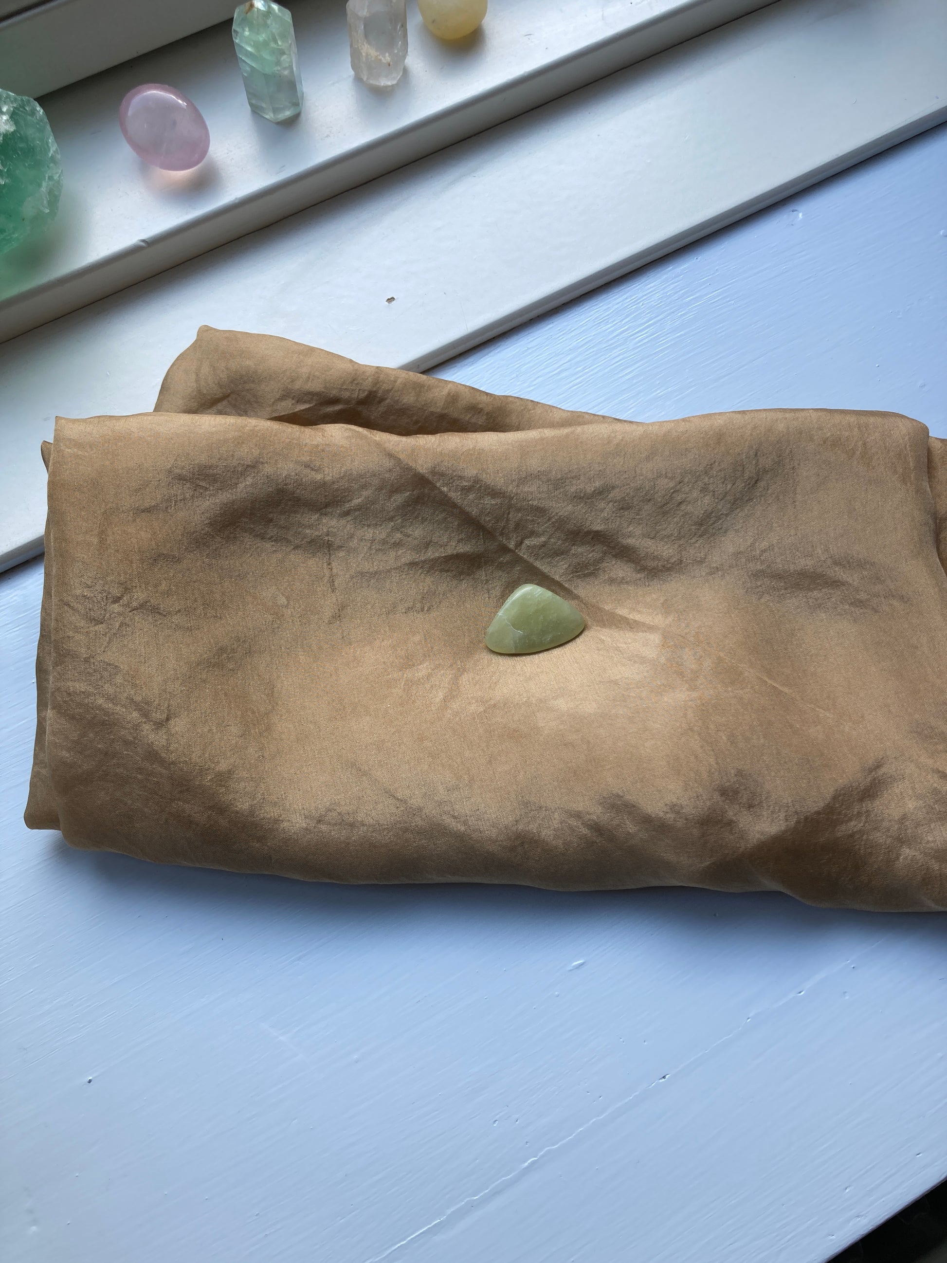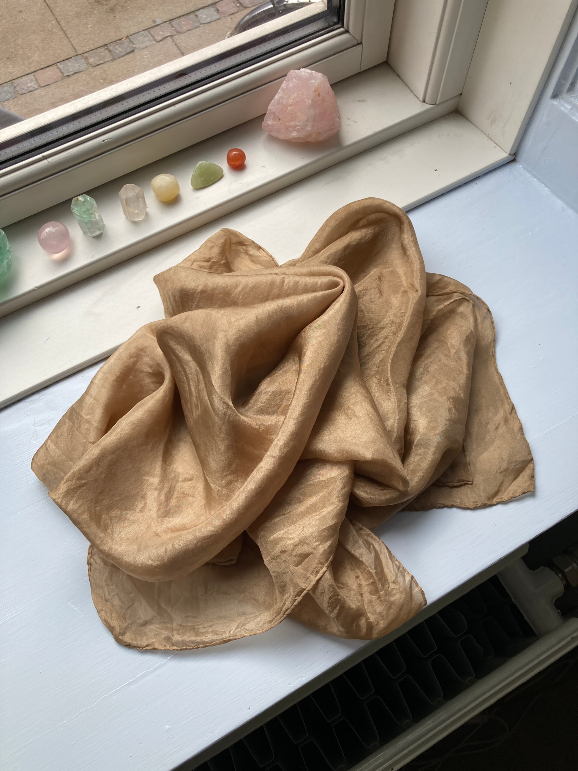 Hvert tørklæde er unikt. Når man plantefarver vil indfarvningen som regel være levende og organisk, hvilket kan medføre små smukke ujævnheder. Dette ser jeg ikke som fejl, men som små skønhedpletter, som giver tørklæderne karakter og personlighed.
